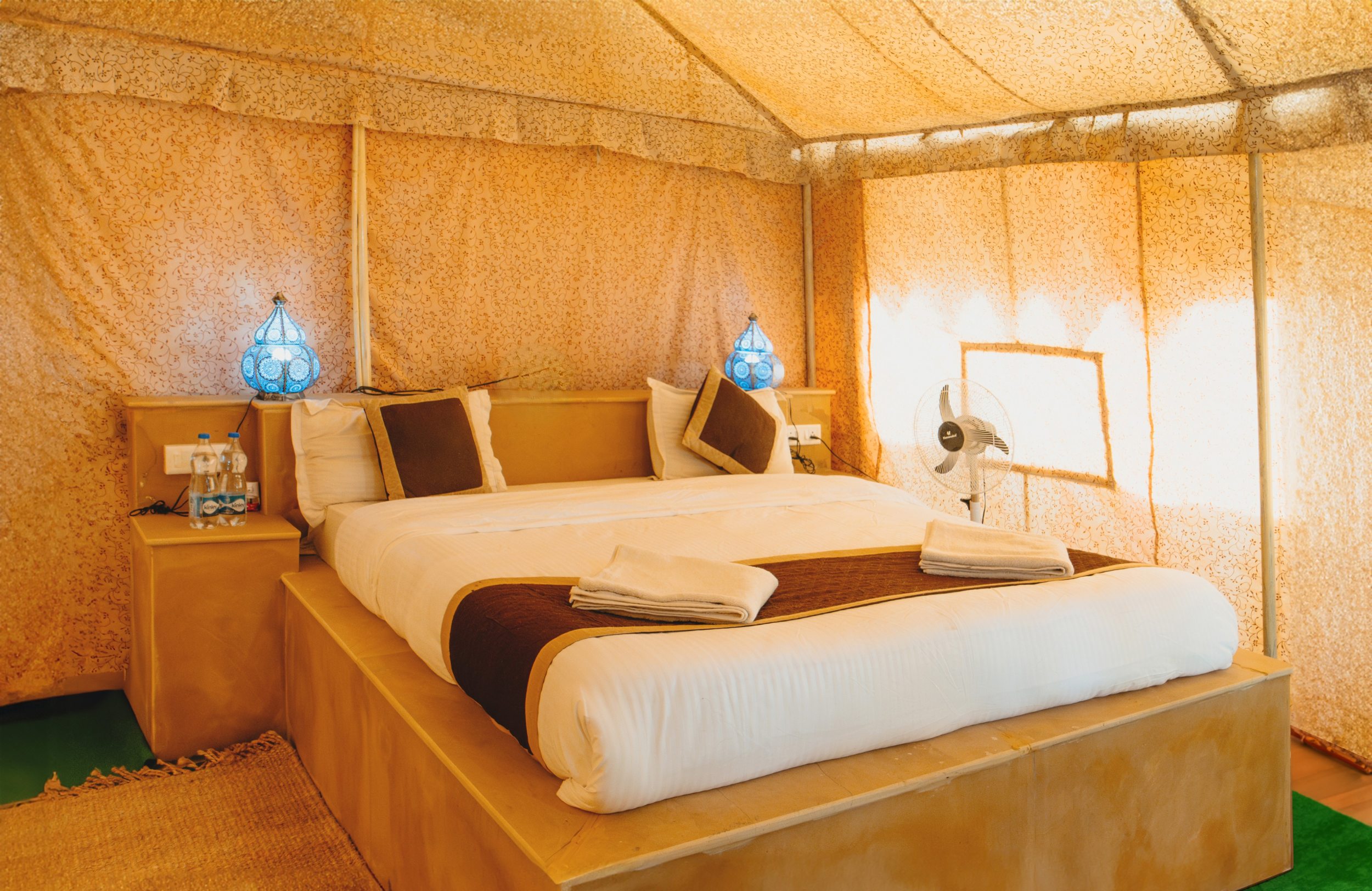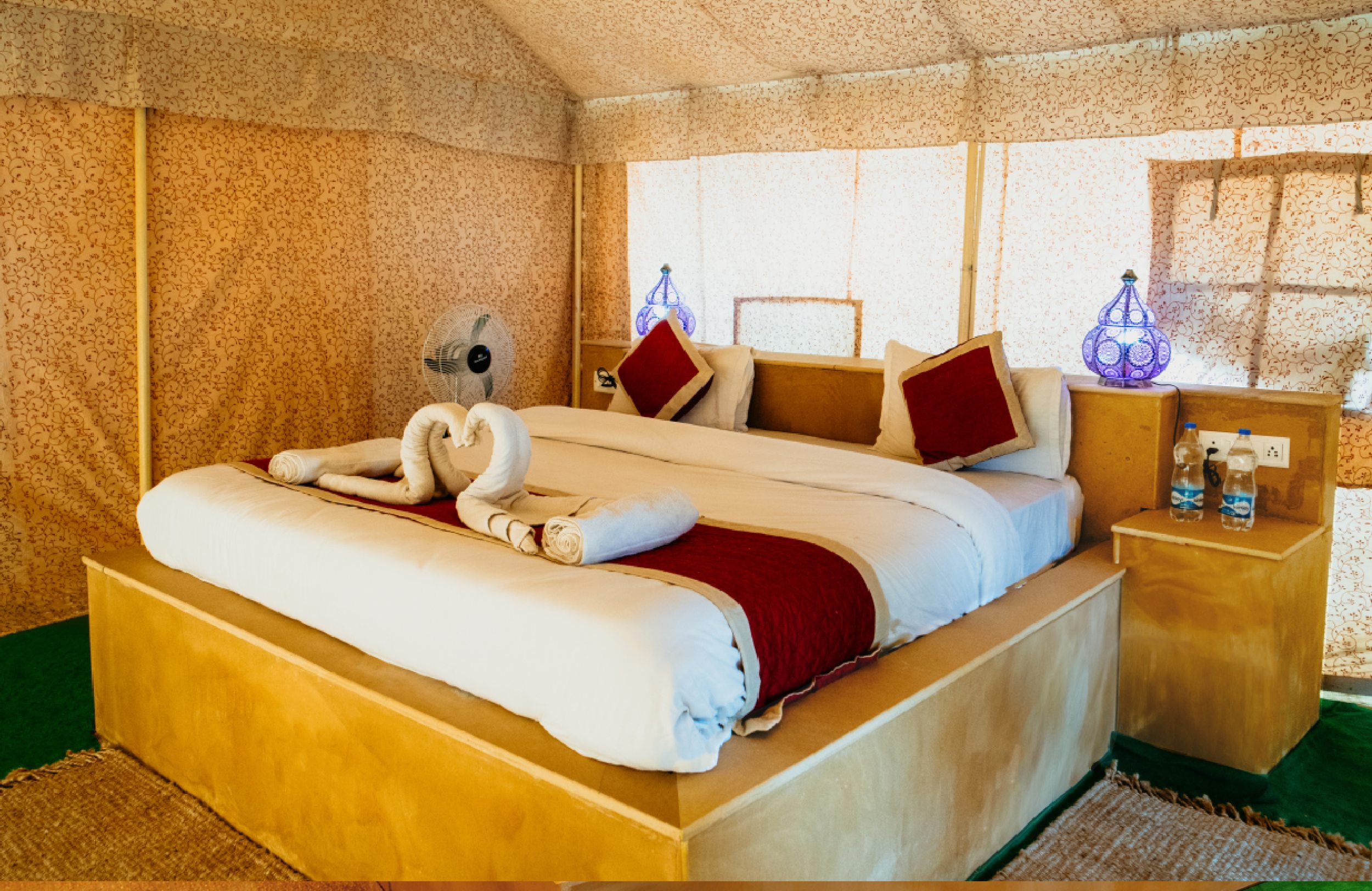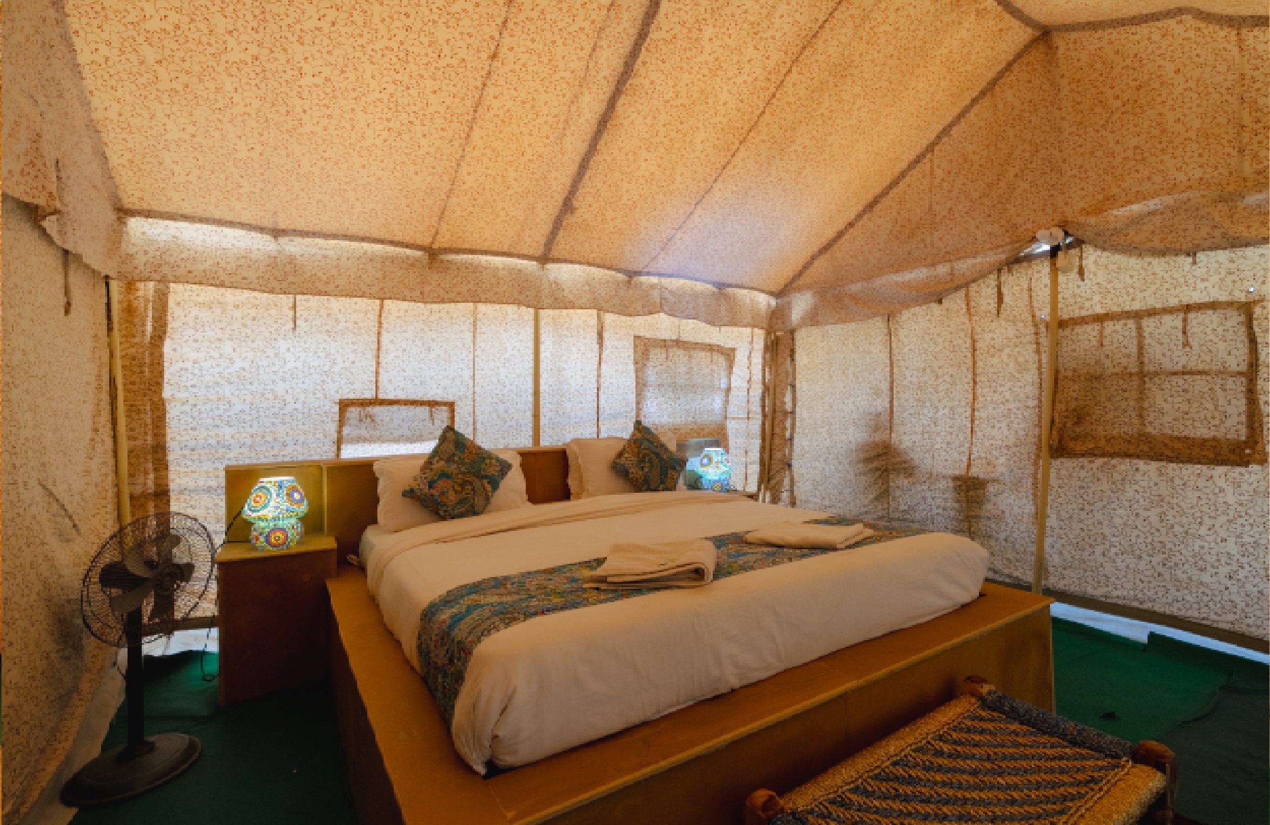 The Desert Swiss Tent is designed for guests who want an authentic desert experience with all the essentials for a comfortable stay. Each tent is thoughtfully built with spacious interiors, including a cozy bedroom, attached western-style washroom, and a private outdoor sitting area. The natural desert breeze and simple yet functional setup make it a perfect choice for budget travelers, backpackers, and those who wish to enjoy the charm of the dunes without missing basic comfort.