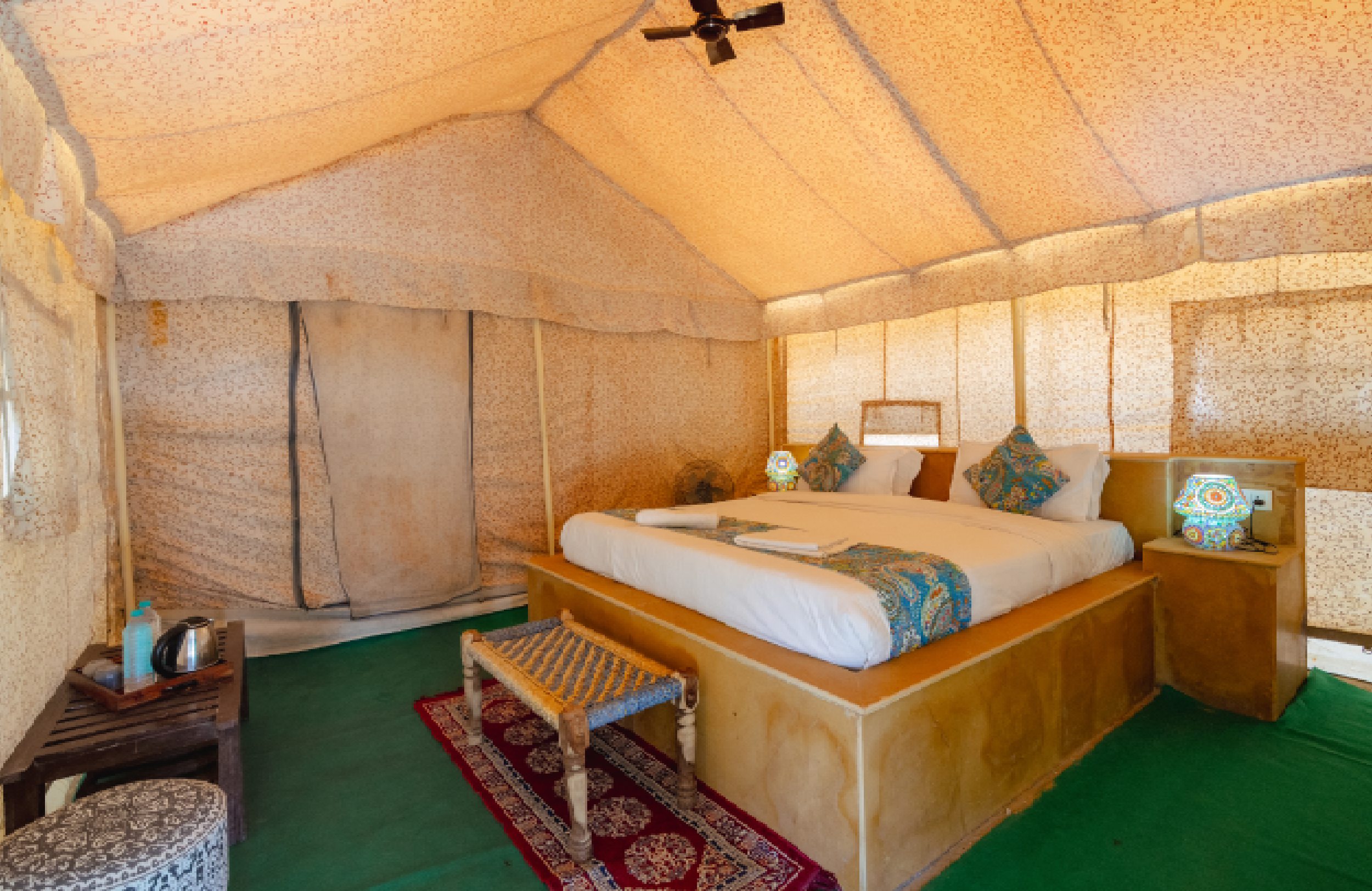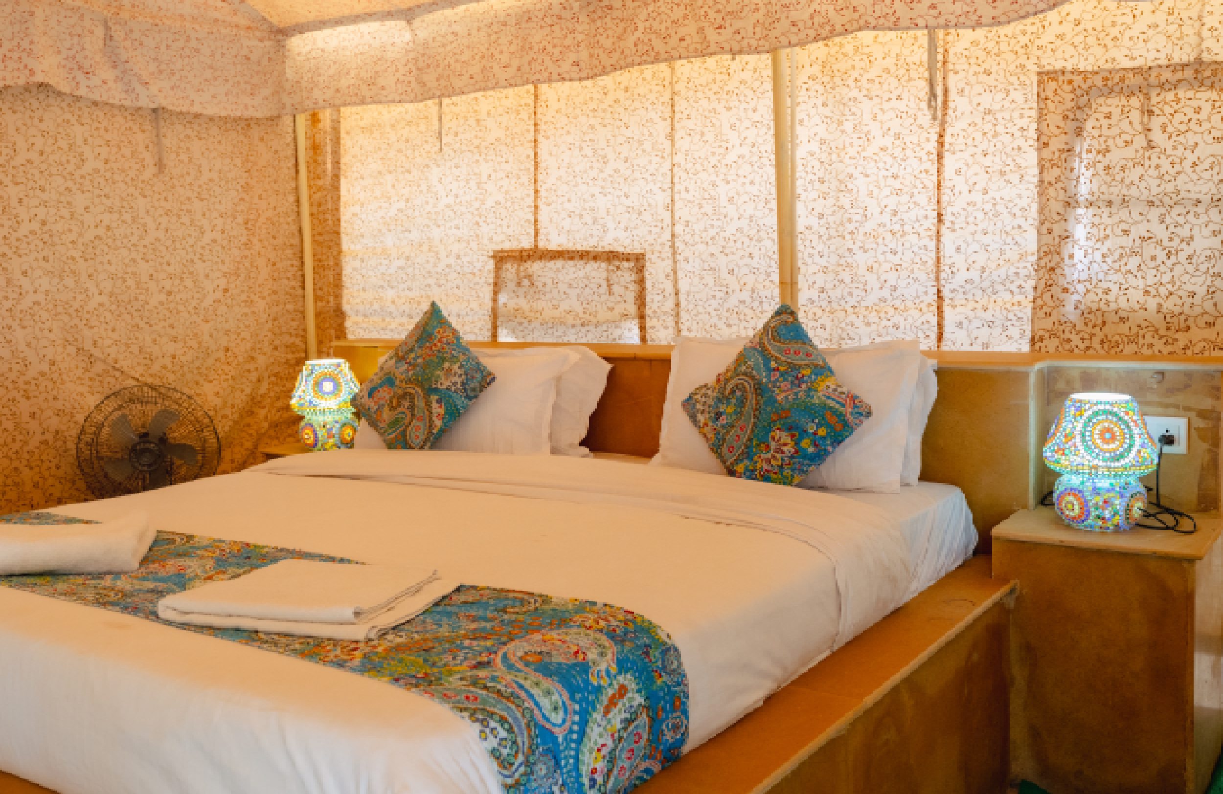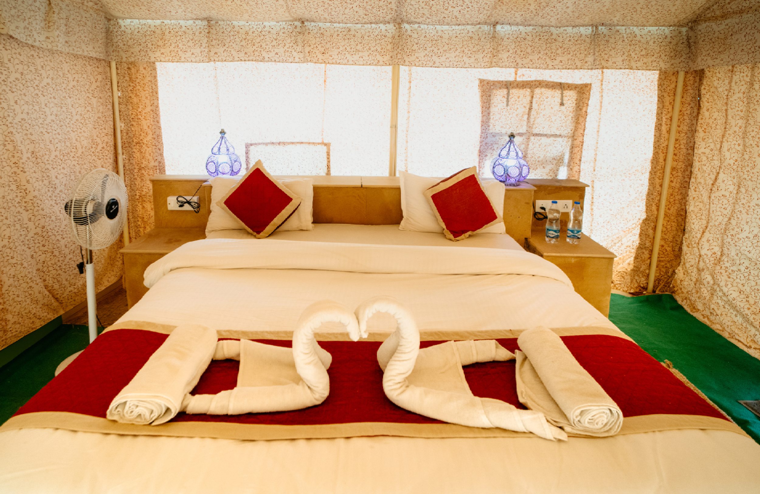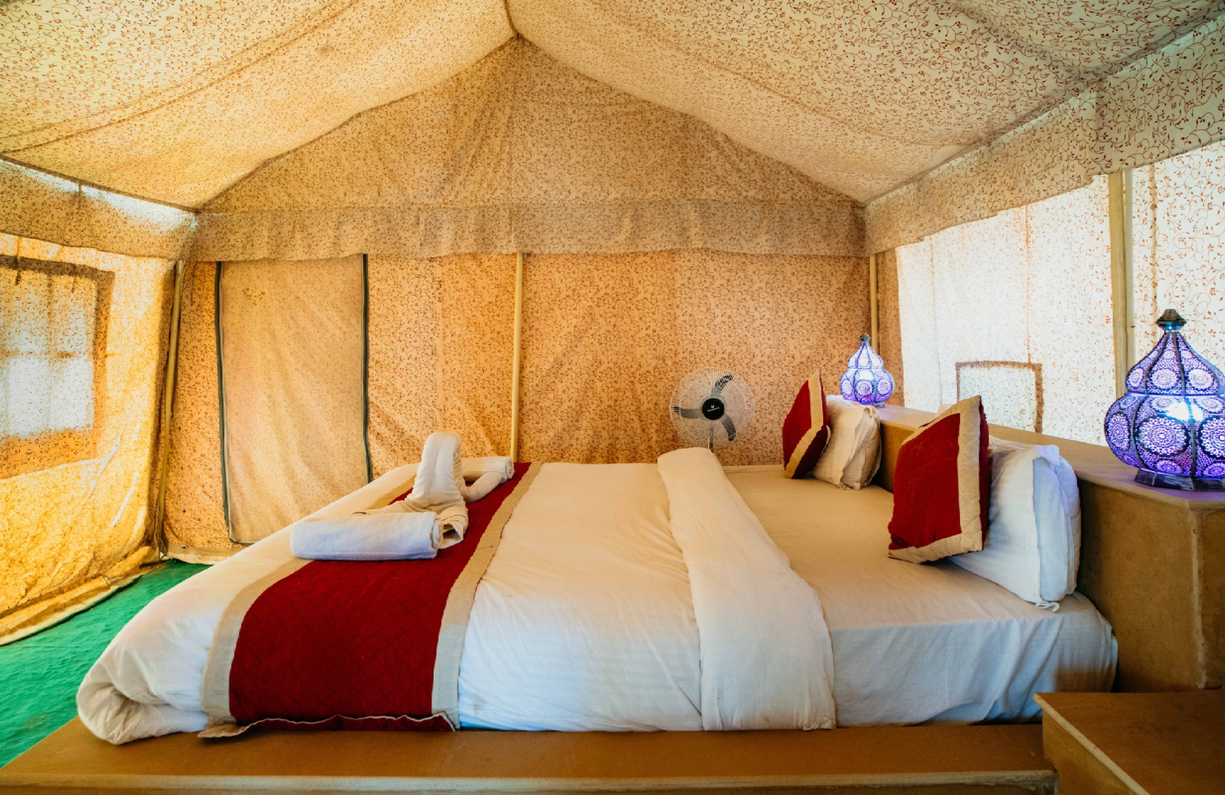 The Desert Swiss Tent is designed for guests who want an authentic desert experience with all the essentials for a comfortable stay. Each tent is thoughtfully built with spacious interiors, including a cozy bedroom, attached western-style washroom, and a private outdoor sitting area. The natural desert breeze and simple yet functional setup make it a perfect choice for budget travelers, backpackers, and those who wish to enjoy the charm of the dunes without missing basic comfort.